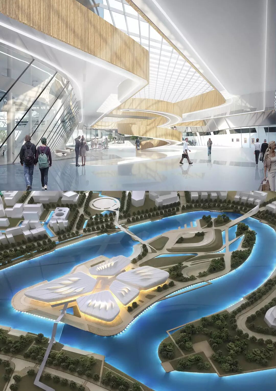 梦里云山故乡水 - 我们在诗意与理性之间努力寻找属于这片土地的划时代建筑。里湖新城文化中心包括大剧院、图书馆、展览馆、青少年科技馆。ADARC / SPDG 的方案希望修复和重建人与自然的关系,以云山、故里为时空背景,水乡、大地、河湾为人文载体,建立典雅精致的新水乡文化建筑。整体设计开放、时尚、创新、亲民,致力反映岭南水乡的时代精神与文化内涵,体现世界水平的前瞻性与独创性,实现功能与文化传承的完美结合。