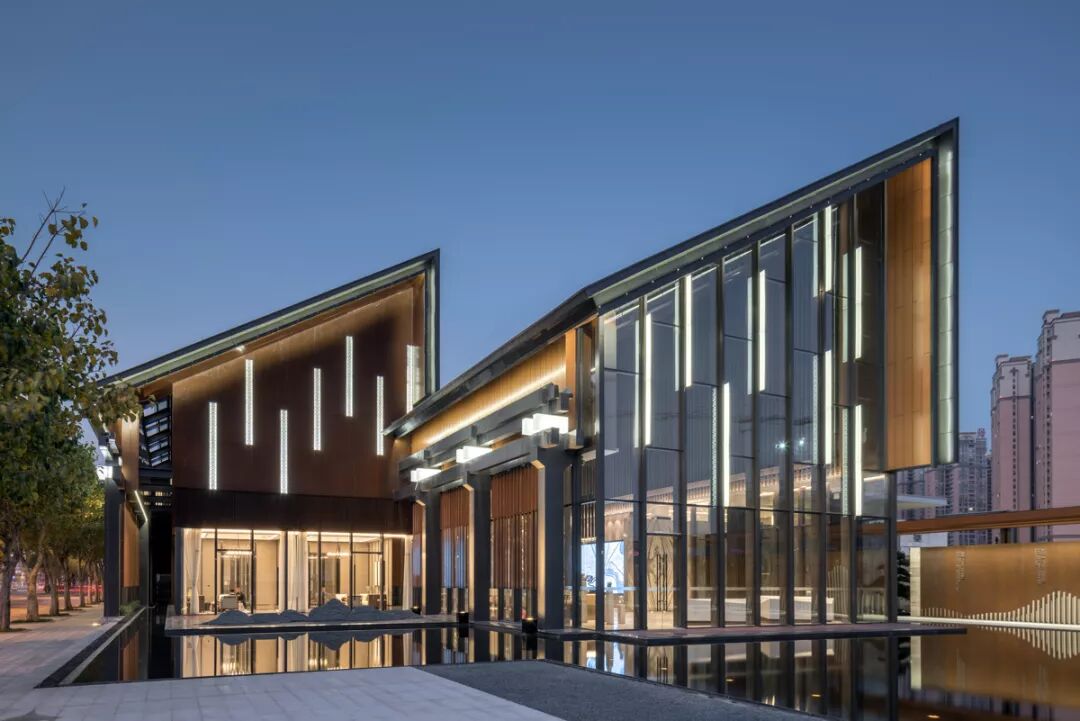 • 建筑由倚立的双楼组成,一虚一实,一阴一阳,相承相生。设计借鉴并创新演绎了中国传统建筑屋顶起翘飞檐的形式,南楼傲天,北楼接地,灵动柔美,轻盈飘逸。前庭设一池静水,将双楼、飞檐、幻天、山水倒映其中。