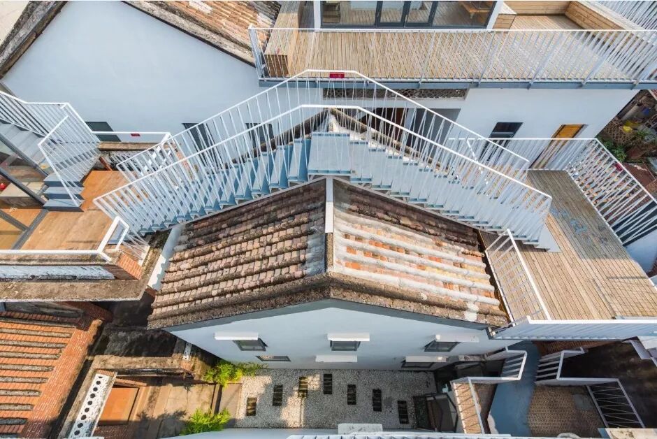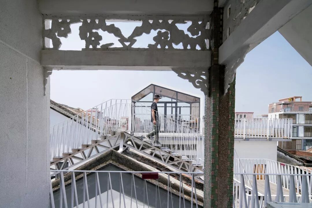 在天空之城组团的设计中,将相邻的四栋建筑原本互相独立的屋面空间,首先通过连桥连成一体,然后分别植入了三个白房子,一个玻璃房子,形成以一个旧建筑屋面作为一个复杂地形,叠加在旧村落肌理上的一片空中楼阁,新的房子就像在旧的房子的屋顶生根发芽,长出来的一样。