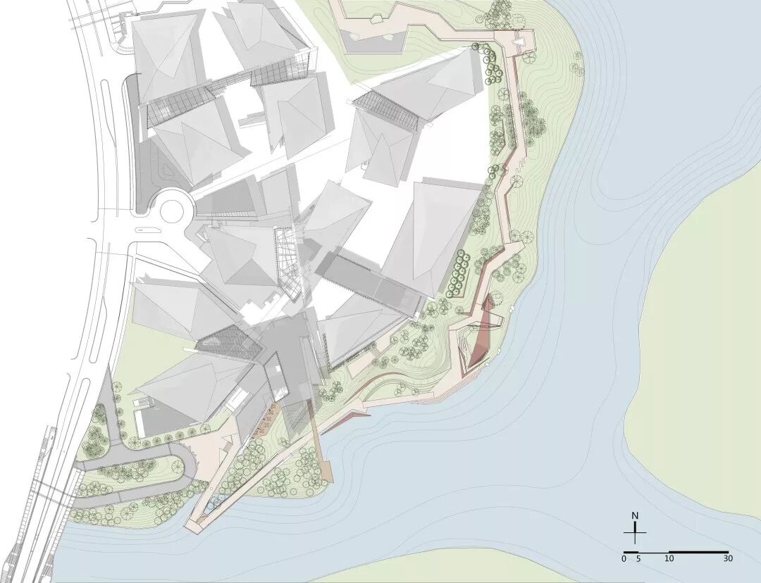 项目属于麓湖艺展中心与市政路、湖区交汇处的一段滨水公共绿地,是麓湖在入口区域与城市共享的一个节点。原场地是从市政人行道向水边单向放坡的地形,景观空间形态单一,而作为艺展中心通往其它地块的重要步行通道,人的行走动线完全被限定在路边的人行道上,人与湖的联系在这里被大大削弱。分析场地现状后,设计团队重新研究该区域的交通流线,试图通过空间的革新让人们获得丰富的观景体验。最终通过地形重塑和立体交通植入,将原本单一的滨水坡地变得立体生动,让人的进入、通过、停留、聚集等行为各得其所。