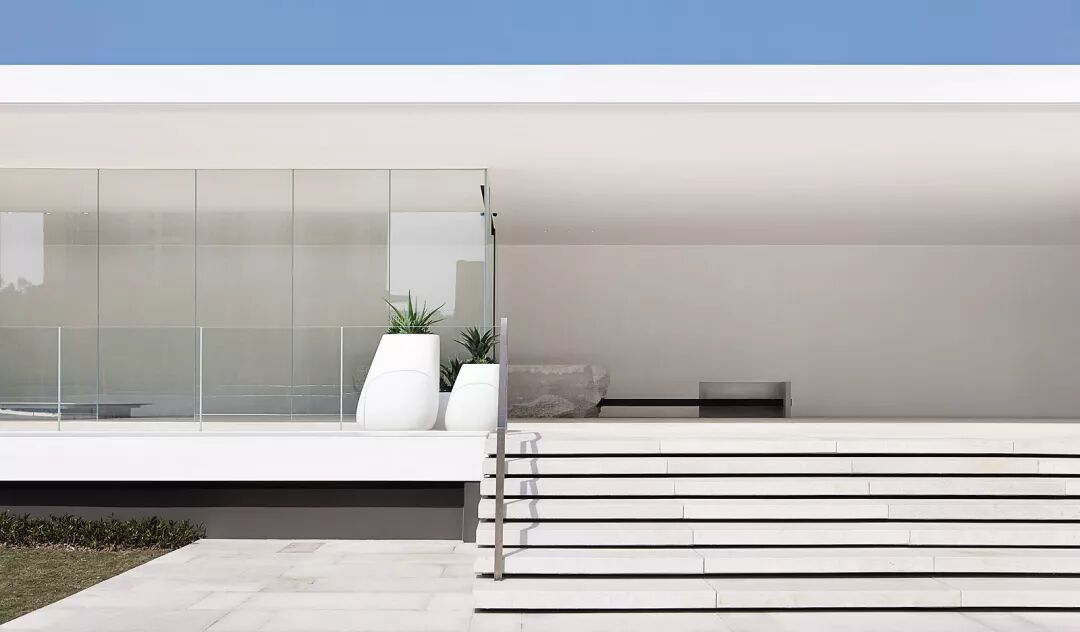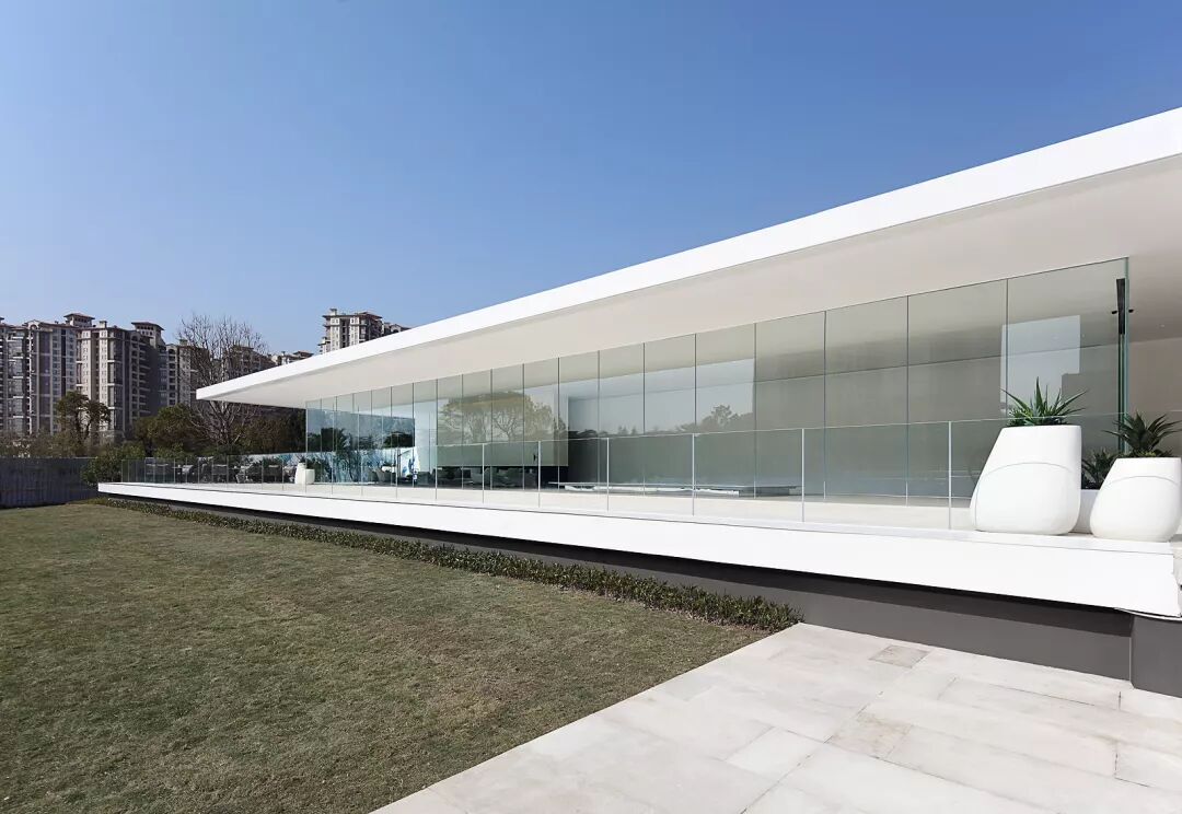 春晓接待中心以一座纯白的柏拉图式的极简建筑,坐落在绿茵草地上,大美至简的现代主义设计手法兼备了中式传统美学的“留白”意韵,令这处建筑化成”纯粹”的符号。剪力墙外悬挑顶板,使其变成无立柱空间,一种戏剧的表现力在这里展开,以玻璃取代墙面,让室内外互相渗透、无垠无界,几何化的空间语言配以简约的空间内饰,设计的统一性与完整性得到体现,并带来轻盈灵动、徜徉流动的感受,让室内外、动与静达到巧妙的平衡,一个放松舒适的乌托邦意味的“城市客厅”也就悄然出现,静谧安然却有着震撼人心的力量。