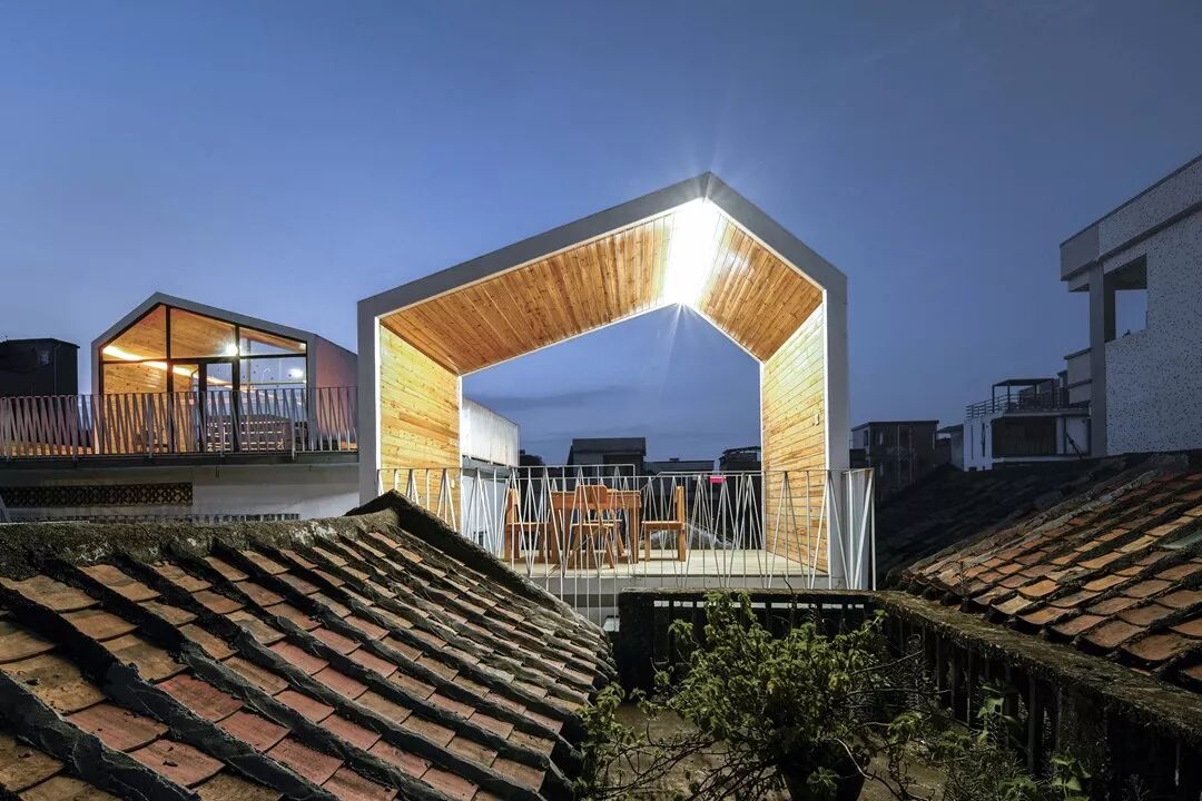 设计将城郊密集型农村进行改造更新,变成散布在整个村落之中的开放式民宿集群,与当地村民共生共存,提升居住品质,而后以民宿形式出租。项目的主要改变在于将空间划分方式由水平单栋住宅,转变为垂直向的公共空间和私密空间互相交织的模式。屋顶除去具有基本晾晒, 种植, 聚会, 休闲等复合功能,还在四栋建筑的屋顶分别植入了三个白房子、一个玻璃房子,再通过连桥将这些小房子连通,将屋面空间打造成一个叠加在老房子肌理之上的一片空中楼阁。建筑上将围墙打破,把四栋房子彻底重构,原本互相独立的屋面空间通过桥连成一体,形成以旧建筑屋面作为一个复杂地形,在这个肌理上生长出新建筑和新的公共空间。