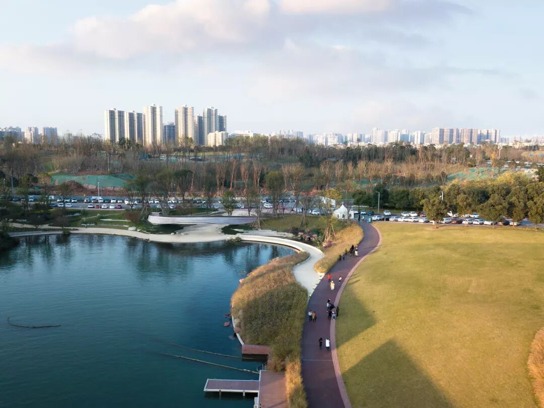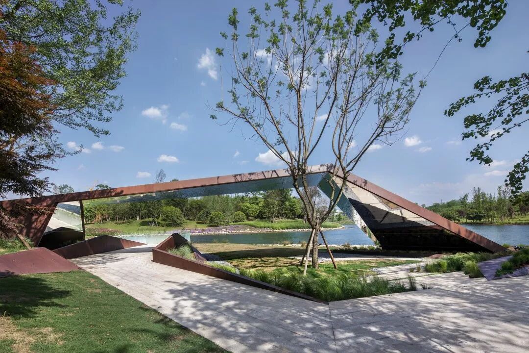 项目所在地麓湖生态城位于四川省成都市天府新区内,折线公园一期主要指的是临近郎酒集团总部办公东侧的L型滨水公共绿地,主要由一条慢行交通路径串联的多个景观功能节点,包括景观步行桥、游艇码头、景观构筑和多个亲水平台。折线公园岸线在上位规划被定位为生态自然景观界面,而滨水办公建筑的设计风格现代张扬,建筑空间的雕塑感与岸线的自然气息有很强烈的反差对比,为协调上述反差,设计团队将折线公园的总体设计目标定义为:建立一套既可以与建筑空间积极对话,又可以在外部呈现出生态自然统一形态的景观空间。
