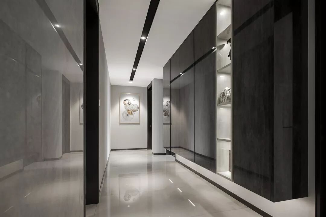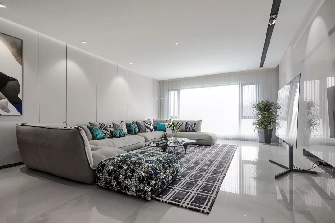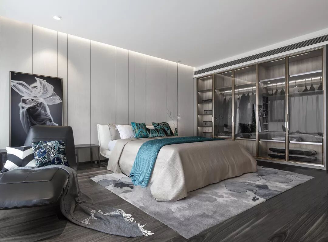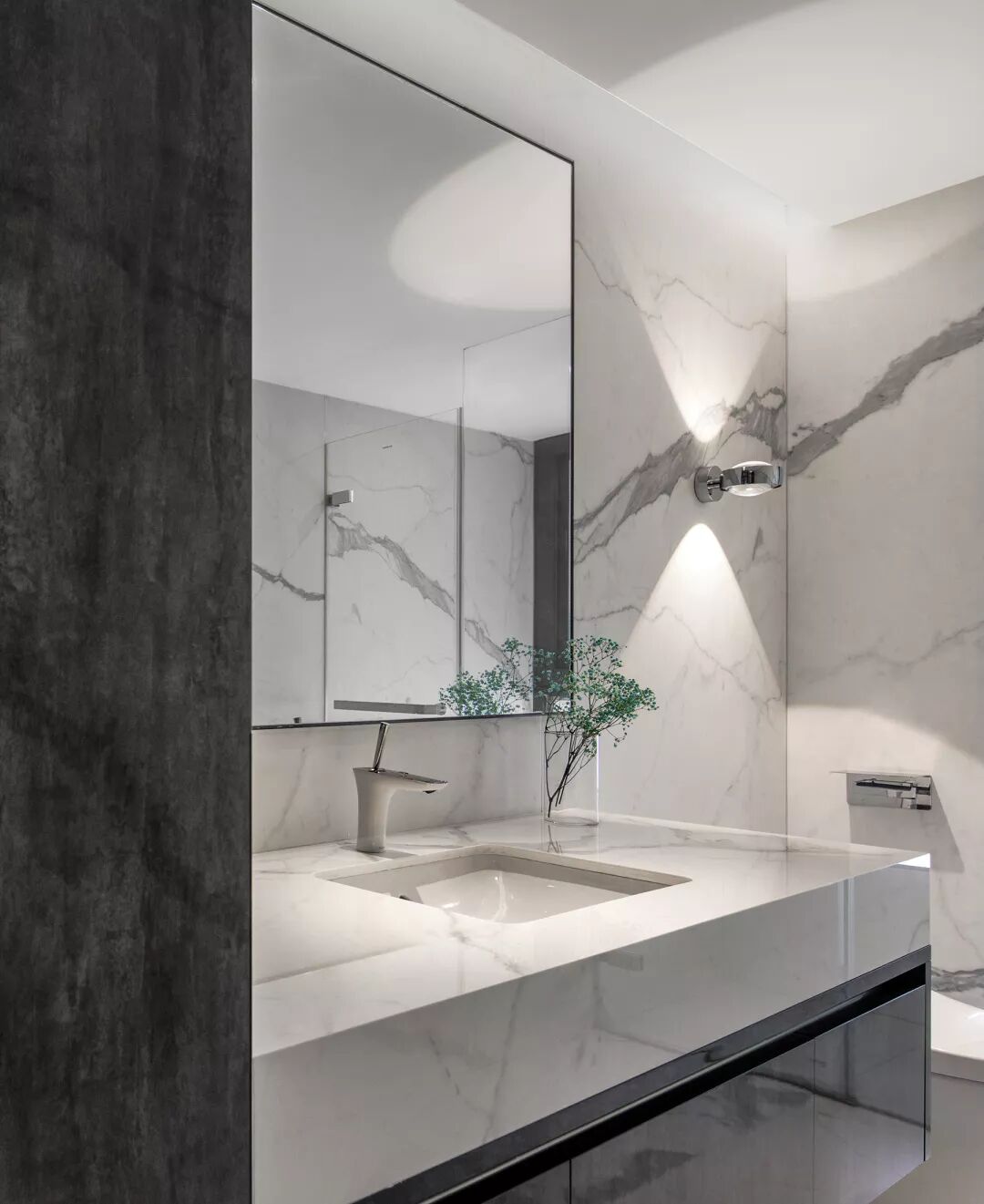 项目给人感觉精致且冷静,富有设计感,在如今繁忙匆促的社会生活中更为人群所需。项目运用典型的现代极简风格,大面积的冷调呈现一种冷艳的状态,硬朗简洁的背景墙具有强烈的视觉冲击力,孔雀蓝色的抱枕和单椅打破了空间的气氛,彰显了与众不同的设计品位。客餐厅的灯光为整个空间营造了轻奢的氛围。卫浴空间大面积使用浅色石材墙面及地面,镜子、收纳柜、洗手池、灯具、甚至毛巾架,所有装置都将简洁做到极致,没有任何多余的点缀,高雅又别致。