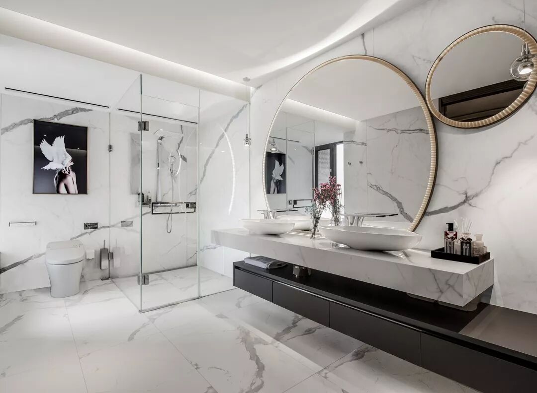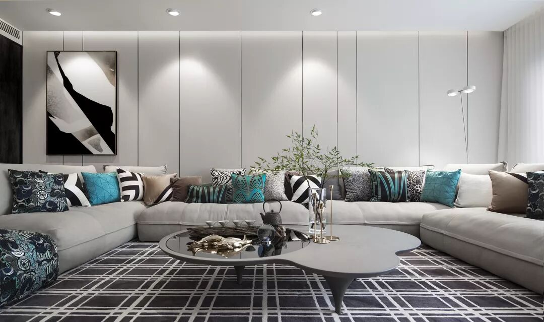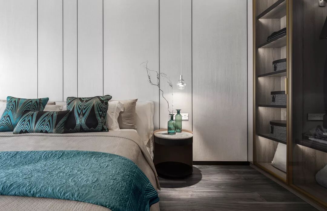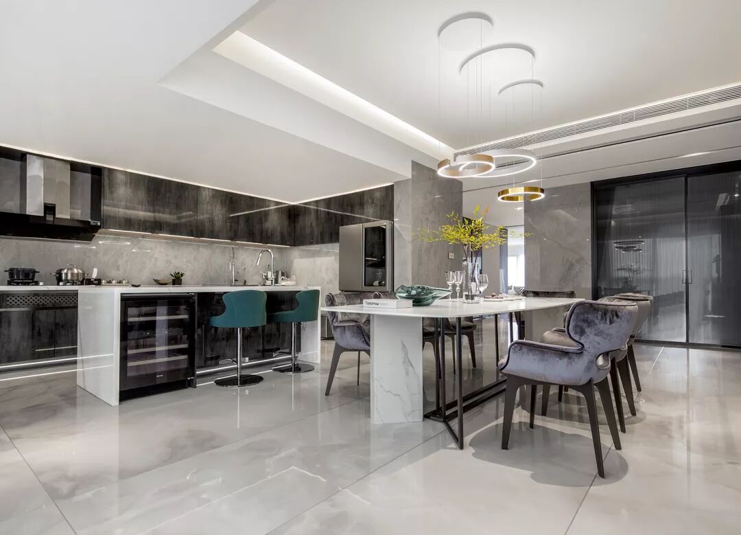 项目给人感觉精致且冷静,富有设计感,在如今繁忙匆促的社会生活中更为人群所需。项目运用典型的现代极简风格,大面积的冷调呈现一种冷艳的状态,硬朗简洁的背景墙具有强烈的视觉冲击力,孔雀蓝色的抱枕和单椅打破了空间的气氛,彰显了与众不同的设计品位。客餐厅的灯光为整个空间营造了轻奢的氛围。卫浴空间大面积使用浅色石材墙面及地面,镜子、收纳柜、洗手池、灯具、甚至毛巾架,所有装置都将简洁做到极致,没有任何多余的点缀,高雅又别致。