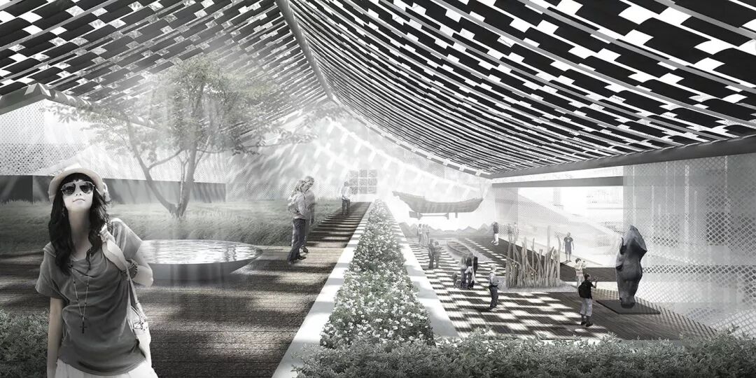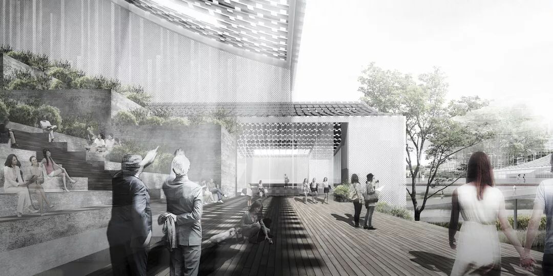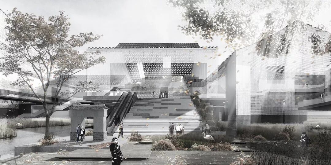 游人于水草间泛舟而入,对称抬起的入口,错落的台阶更是户外剧场的观众席,提供天然的户外场地。串联各展厅错落别致的游廊,将模糊室内外的空间关系,形成处处观景,展廊展厅互融的效果。