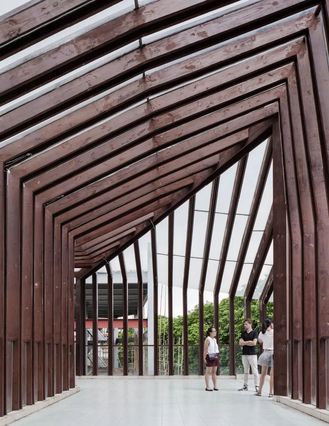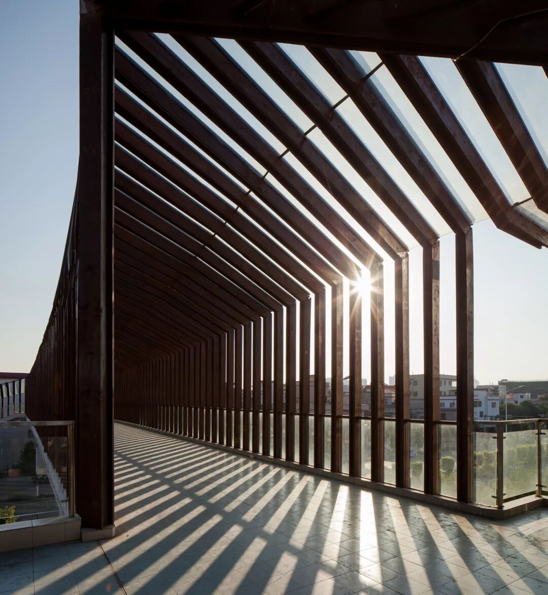 当代中国,发展急促,城邦之间,城市快速发展夸张,让乡村不断被城镇化,路权被侵蚀得支离破碎。而本项目通过政府与建筑师合作,在村落文化中,让荷岳步行街带着旧日筑痕链接回城市与城镇、居民与本土情感。采用当代的设计手法,配以朴素的木材构造,在现代技术与传统文化的邂逅中,用当地民居建筑的元素,在完善使用功能与满足设计美感的同时,让步行街以自然的形态,融入到周边村落建筑之中,遵循“润物细无声”的东方人文价值,悄然表达对于乡村本土情感与文化的尊重与珍惜,也完成对人、建筑、环境和谐并存下的一次探索。