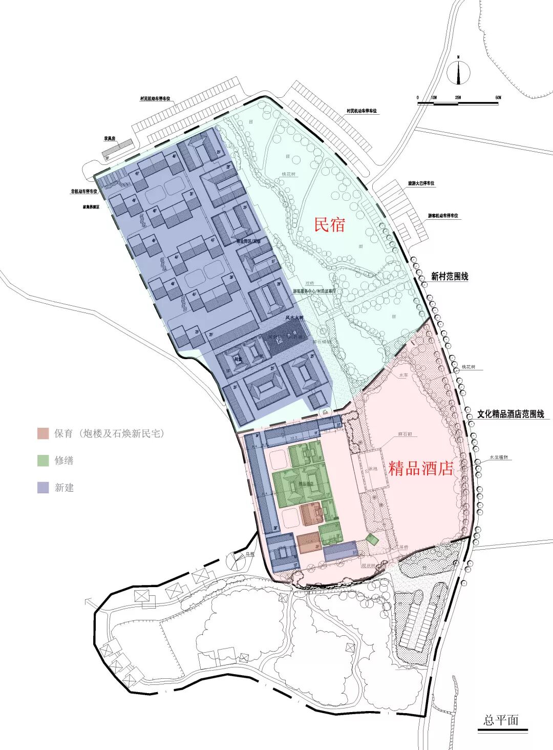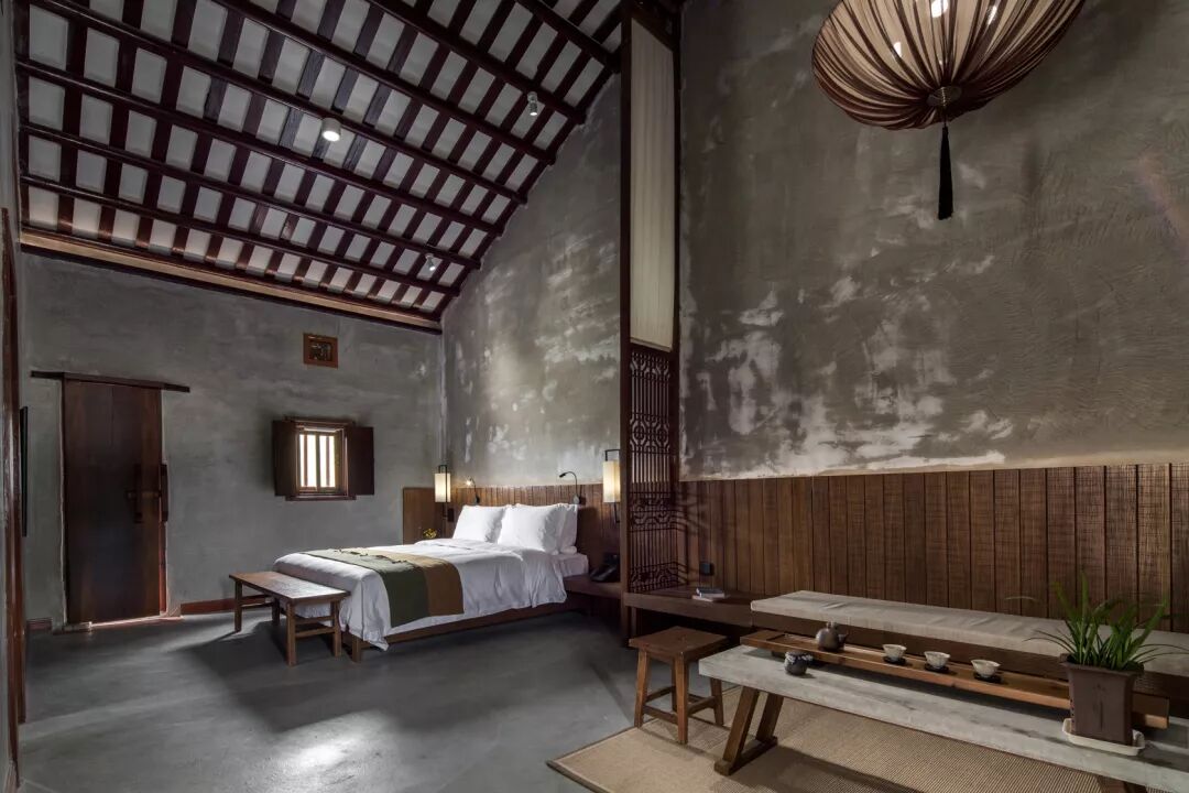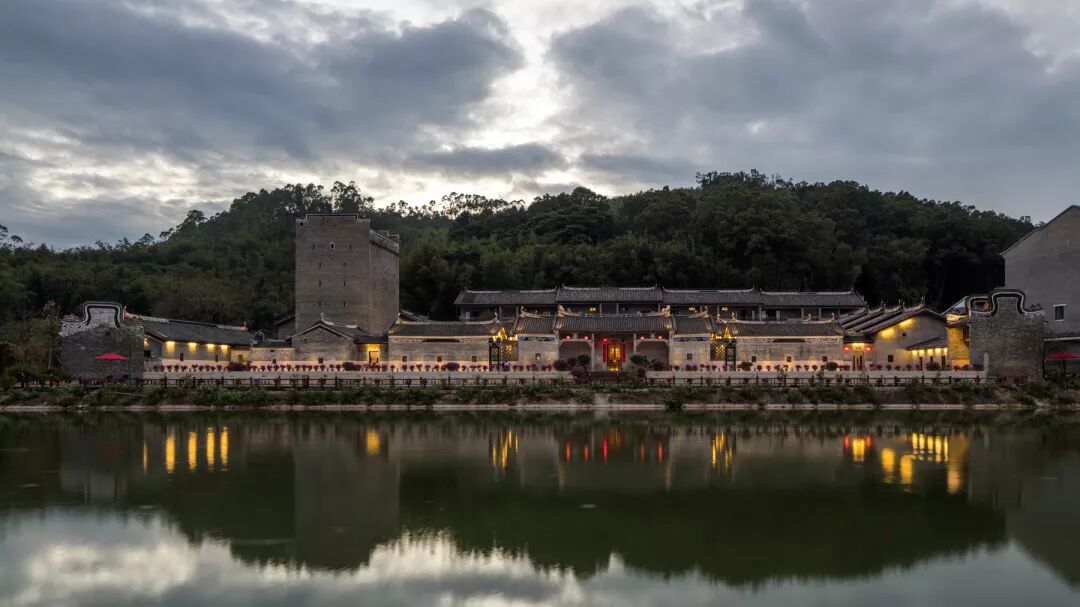 邓村石屋田园度假酒店的原址是始建于清朝的客家围村,如今仍然保留着已经被列为历史文物的建筑群,包括用于战争防御的碉楼、祠堂和民居。在原生民居的基础上,设计师以新并旧,将现代时尚融入岭南客家建筑风格之中,为古建修复之余,亦增添了现代风尚。多重庭院和天井之间,以柔美的园林水榭点缀,充分印证了客家传统建筑理念:将独立的建筑融入整体氛围,构建整体性景观,引领宾客在每个转身处都能感触到新的空间、层次和气氛。