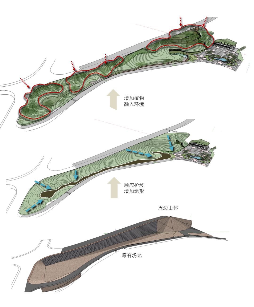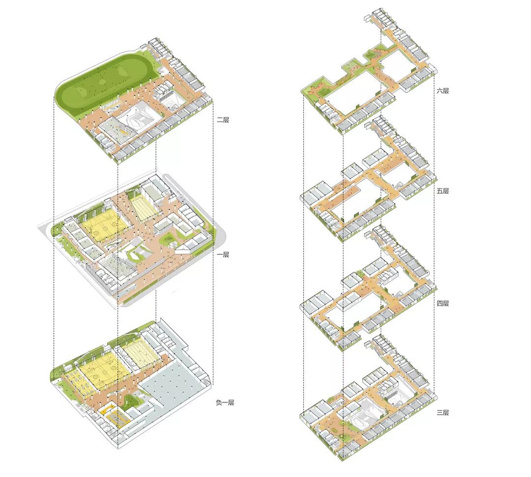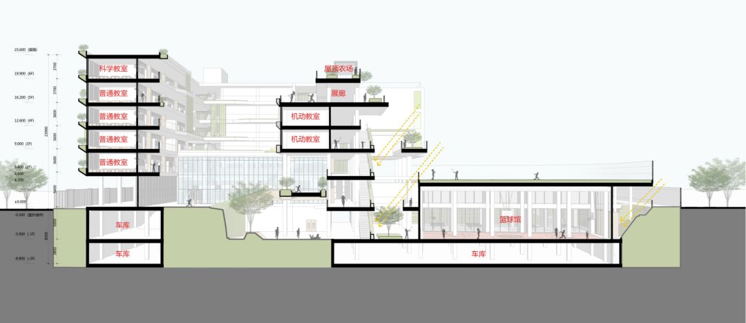 1、对原有场地的尊重和提升;2、满足最大限度的扩容需求;3、立体化的公共活动空间;4、开放灵活的平面布局概念;5、活动设施的社区共享。项目剖面设计解析了一切:活用场地高差创造空间特色并有效解决交通接送问题,让绿化流淌、让地下空间引入阳光,让教室与自然连结,一切最终让孩子快乐学习。