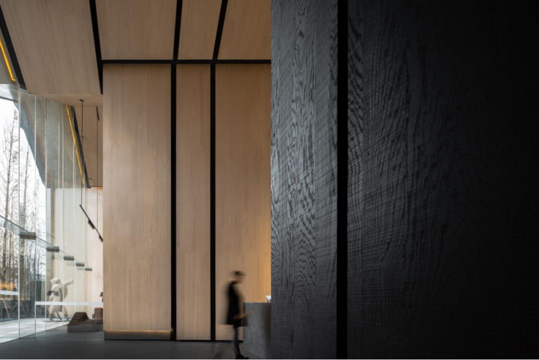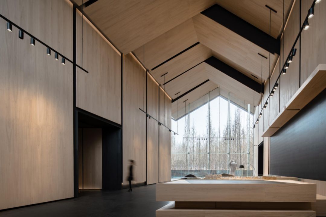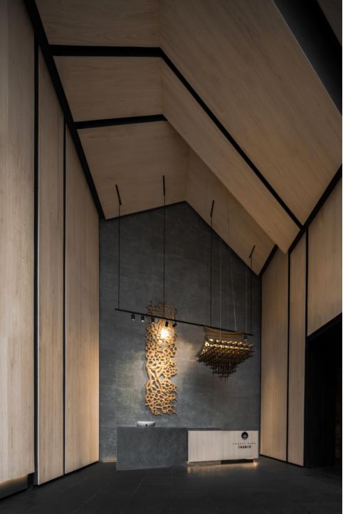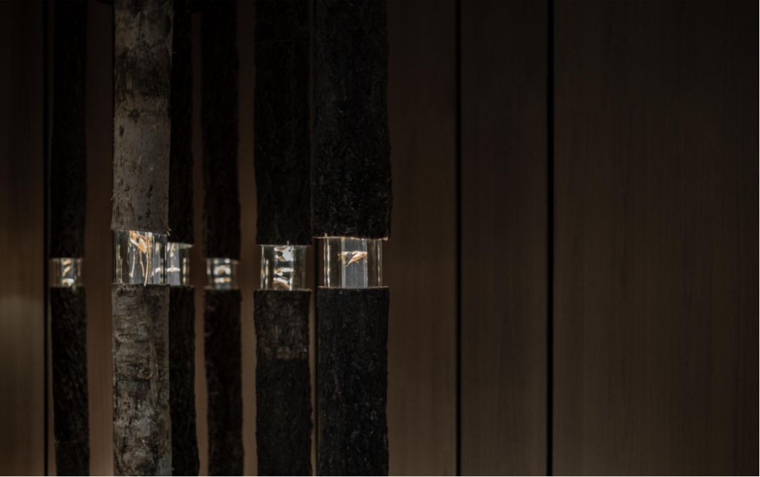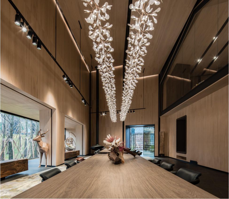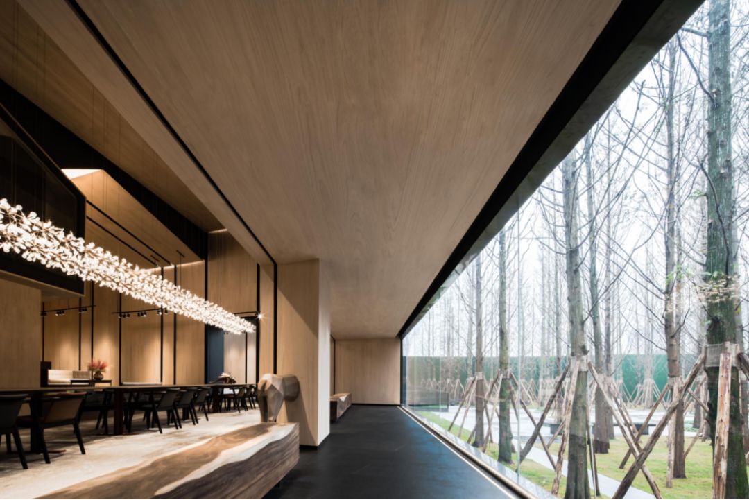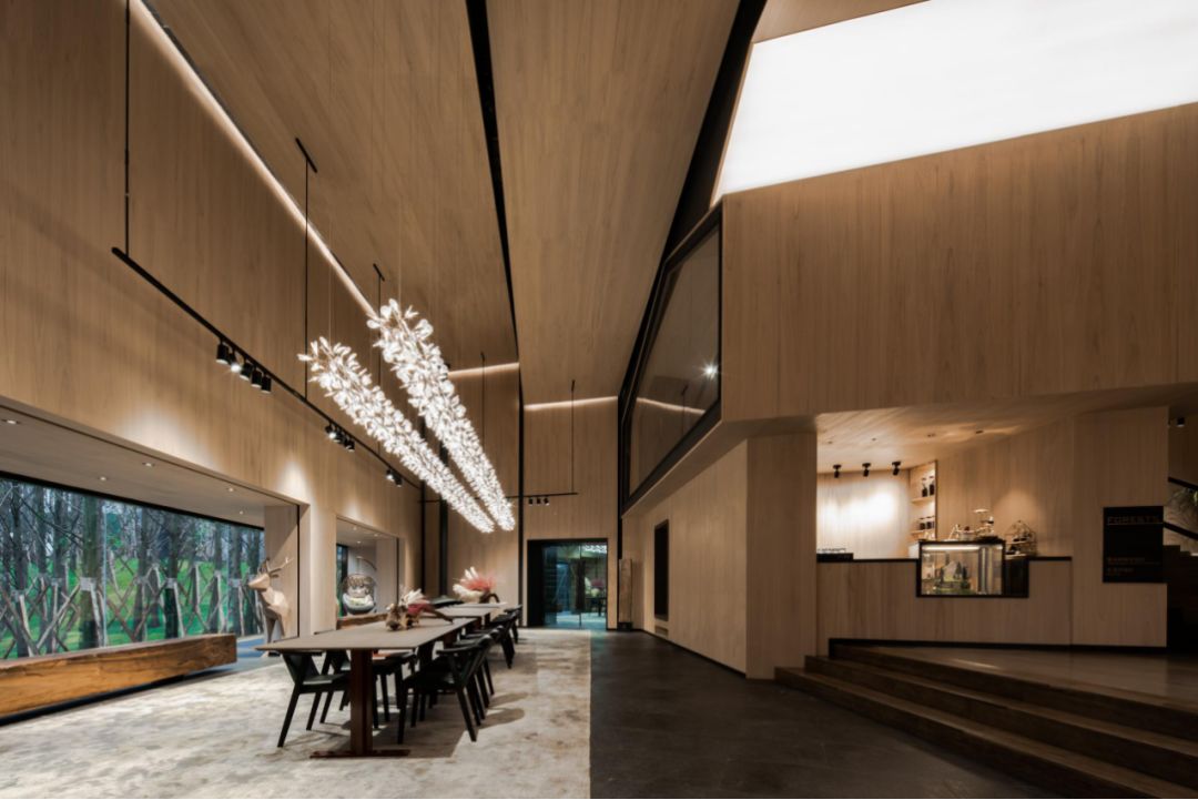 室内设计在此基调上,取纳自然所赋予的安静与宁性,将自然、空间和光影融为一体,塑造了一座当代又极富自然感的售楼空间,一个生长在森林中的会呼吸的小木屋;设计师将森林的元素加以提炼、延伸和艺术化创造,演绎成小木屋里的艺术品形式,此外,除了形态元素,还在其中融进了森林的触感,将森林里触手可及的材质——木材,在室内建筑饰面以及软饰上进行大量使用,让身处室内的人们从感官上能感受自然;在用色上,空间以大面积的木色为主基调,搭配生机勃勃的翠绿以及淡雅的灰绿色,家具面料上搭配高级灰的皮革,使空间整体和谐悦目。