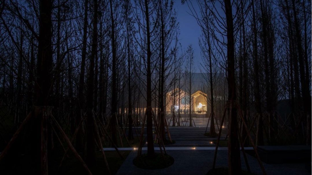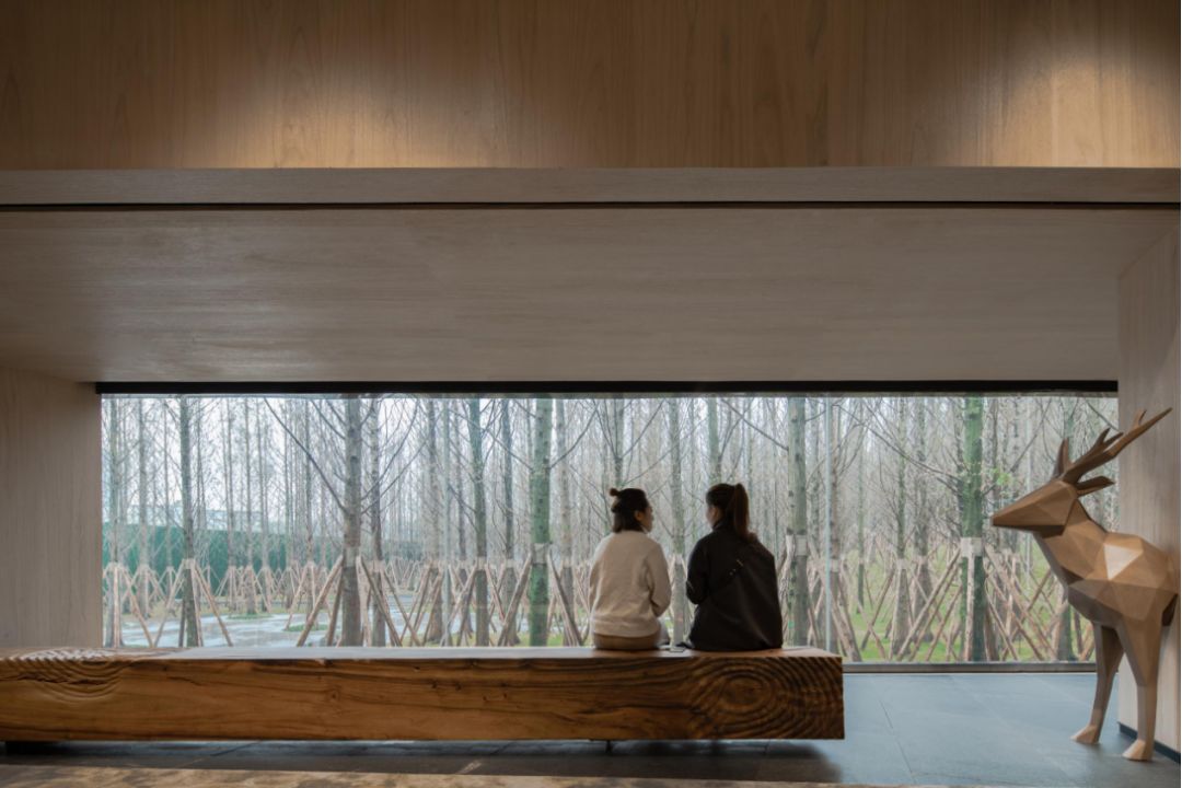 5000平米的水杉林是景观设计的大手笔,完美的将建筑「消隐」到自然里面。建筑设计以一面巨大的“镜子”面对这片水杉林,在“镜子”底部切割出一座小木屋。
