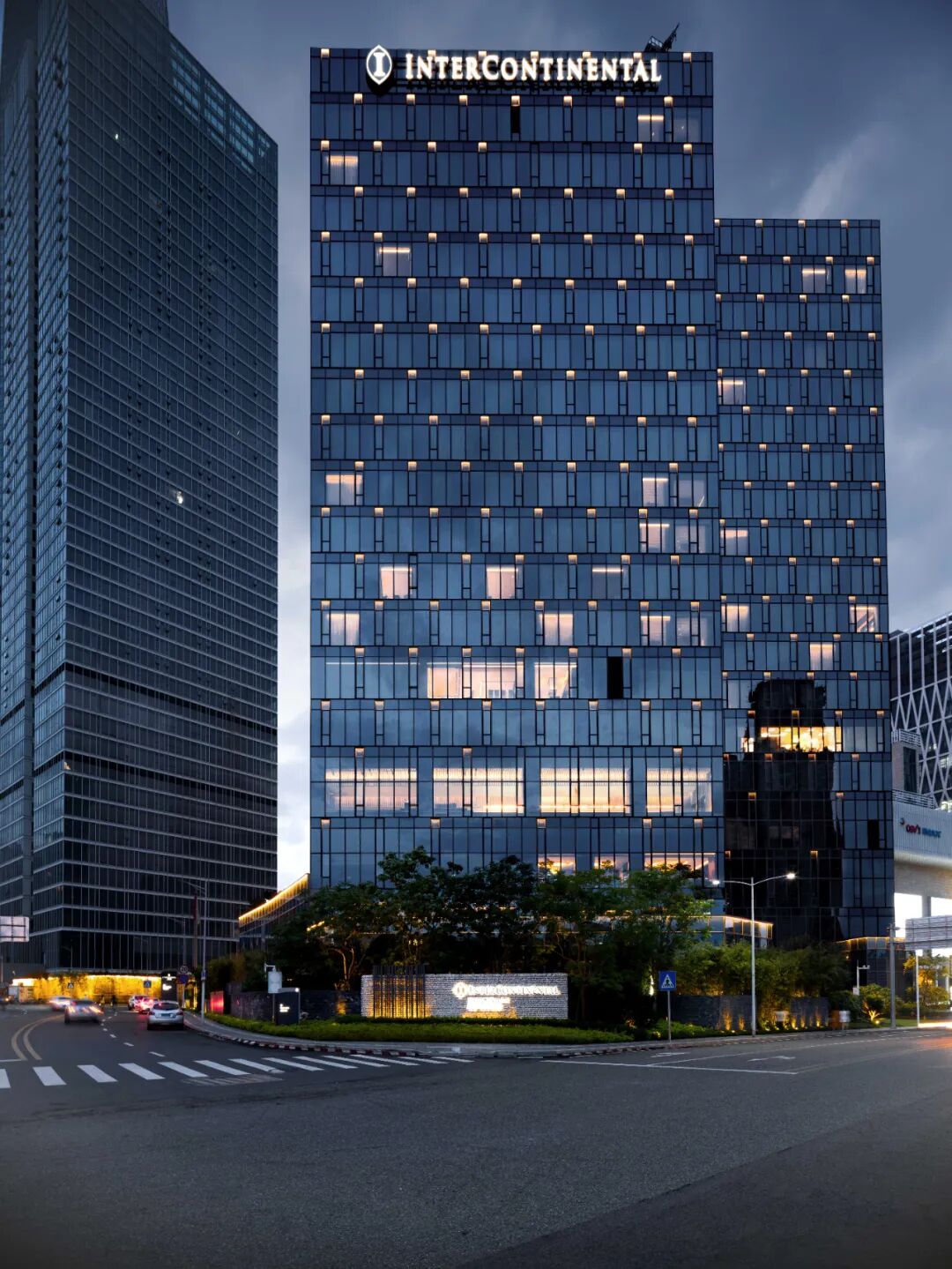 项目室内大堂及公区设计充分汲取了建筑中三角形的立面元素,并且以LED长直灯带,以及大堂拼叠背景板的方式予以强化。通过灯光和铝板,穿孔板等材质的综合运用,以成熟的设计语言打造了具有浓厚商业风格的办公大堂。