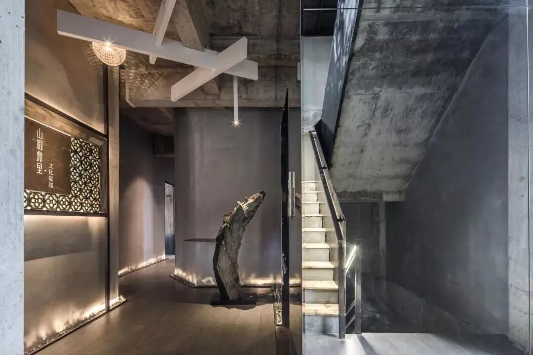 休息區面對接待臺,陳舊的老樹木根年代感十足,環繞臺前。電梯左側墻面的金屬鏡面反射裝飾陳設,擴大了視覺面積。不規則條狀燈掩蓋吊頂的空白,輝映其中。
