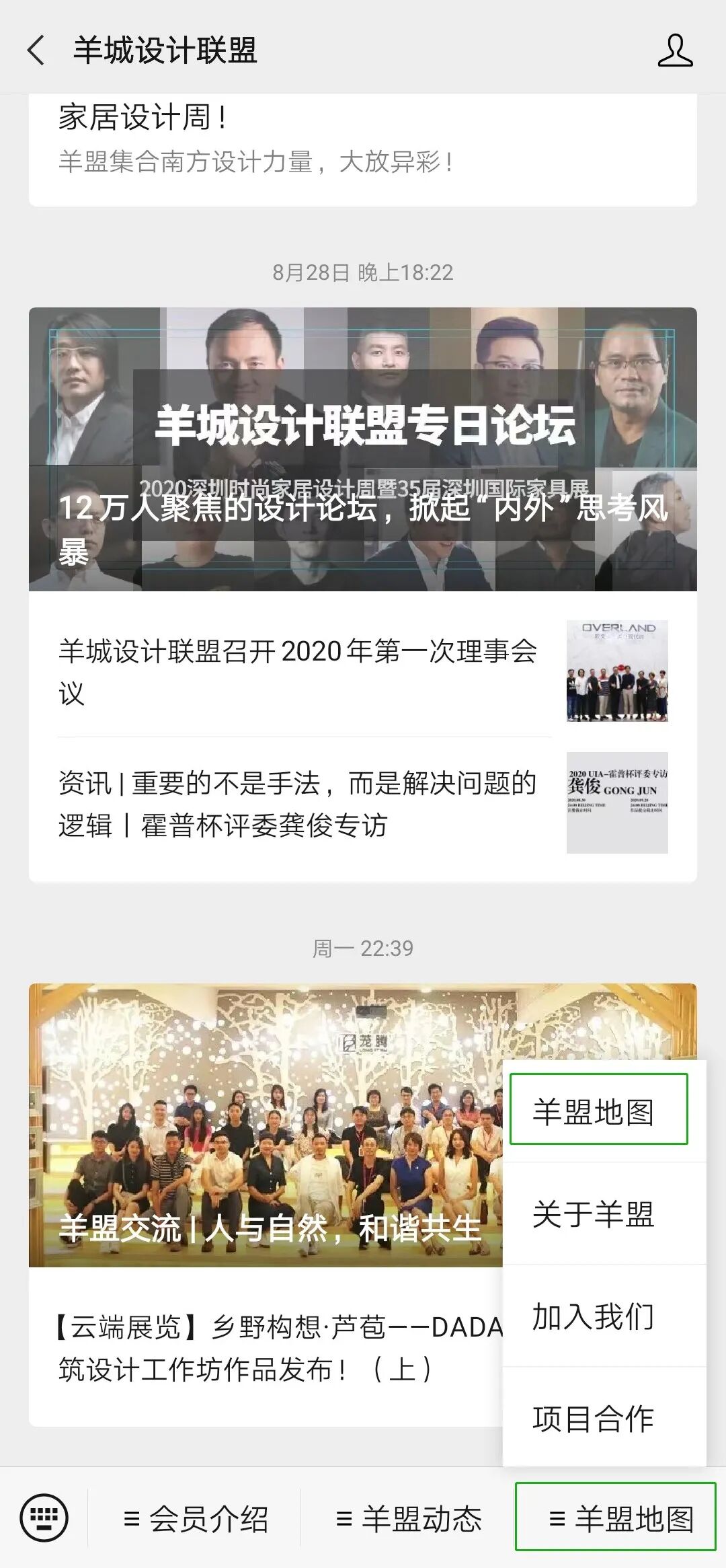 打开“羊城设计联盟”公众号,点击菜单栏最右边“羊盟地图”第一栏,即可进入“羊盟地图”小程序。