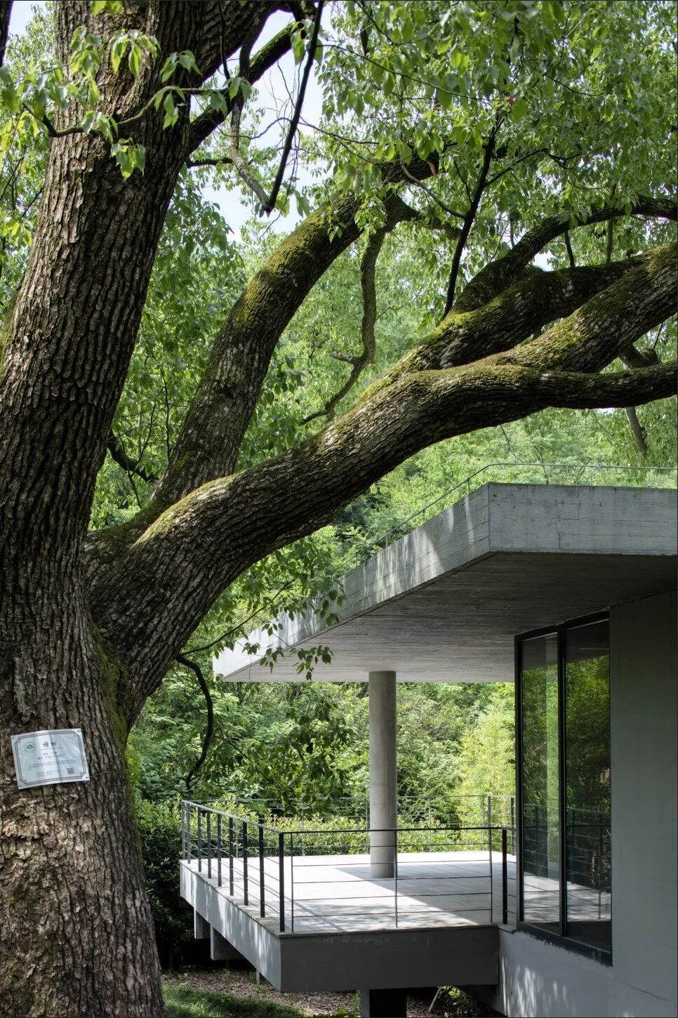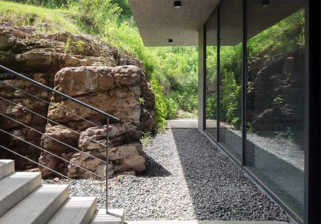 混凝土作为一种在自然环境中介入感比较强的材料,与建筑整体谦和的体量策略达到一种平衡;而木模板特有的纹理又赋予了混凝土材料特殊的尺度和质感。采用清水混凝土夹心墙,避免了设备暴露带来的二次装修,强化空间的纯粹性。在乡土传统的大背景下,探讨存在于江南山水环境中建筑的另一种可能性。