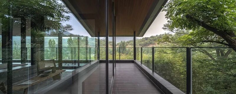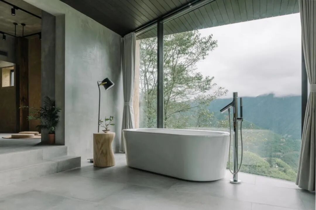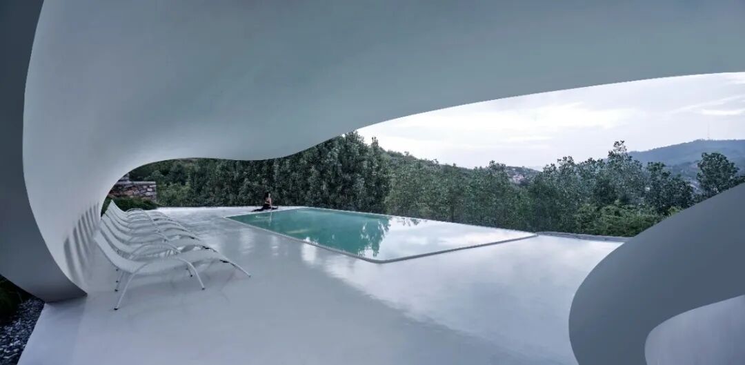与之相邻的是泡池和健身房,则在构造上尽可能地简化以达到外形的纯粹流畅,大悬挑的异形曲面钢龙骨形成行云流水般的形体并主动收纳外部流动的风景。书房与泡池高低错落在山峰间,如林海之巅的云卷云舒。大道至简,我们希望以最简洁直接的方式将其归于自然,与自然共生。
