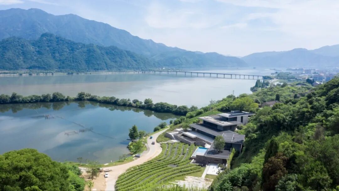 渔乡茶舍位于杭州建德,三江交汇处,风景界面最大化和体量融于环境是设计之初的两个基本出发点。方案没有追求一个焦点式的视觉形象,而是以消解体量的片层形式呈现,且以巧妙的动线设计将游山观水的情趣引入室内空间。
