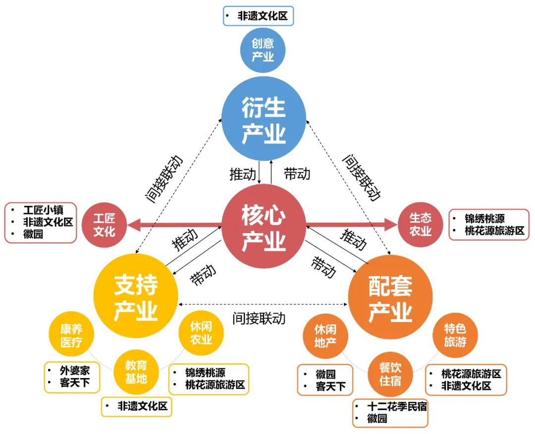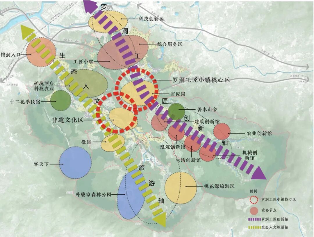 项目以工匠工艺和生态人文为主要发展方向,采用以“点”带动“线”,从而带动“面”的策略对地块进行整体考虑,致力对原有地块进行文化再挖掘、形象再塑造、功能再优化,从而注入全新活力。规划形成“一心两轴多节点”的空间和产业体系:工匠小镇核心区作为主要打造的聚焦中心,在整体规划上起到了统领和聚合的作用,工艺和旅游两条发展轴串联非遗文化区、百匠园、综合服务区、工匠小学等节点。工匠小镇获批成为省级示范小镇,区域内投资项目众多,拥有客天下、外婆家、桃花源等一批优秀开发项目,是乡村振兴背景下城乡融合发展的示范区。