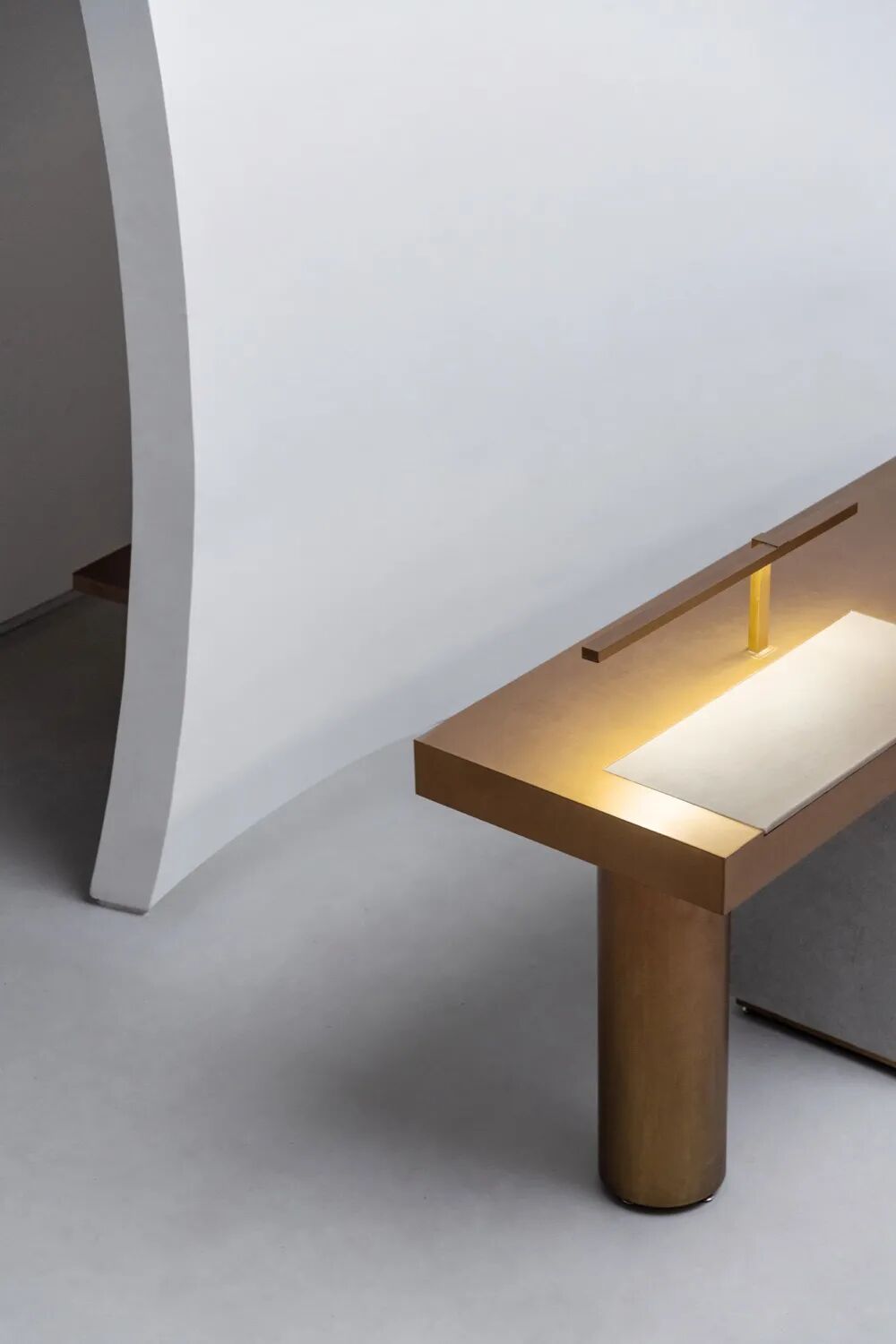 墙面经过精细打磨粉刷,曲线形成的弧度延伸向下,微妙地把空间划分成舒适的休息之处,属于放松休息的空间于神圣庄严的长廊形成微妙的呼应。来往时空长廊的人们不知道在接下来的路上将如何发展,但依然坚信在未来实现一切可能。