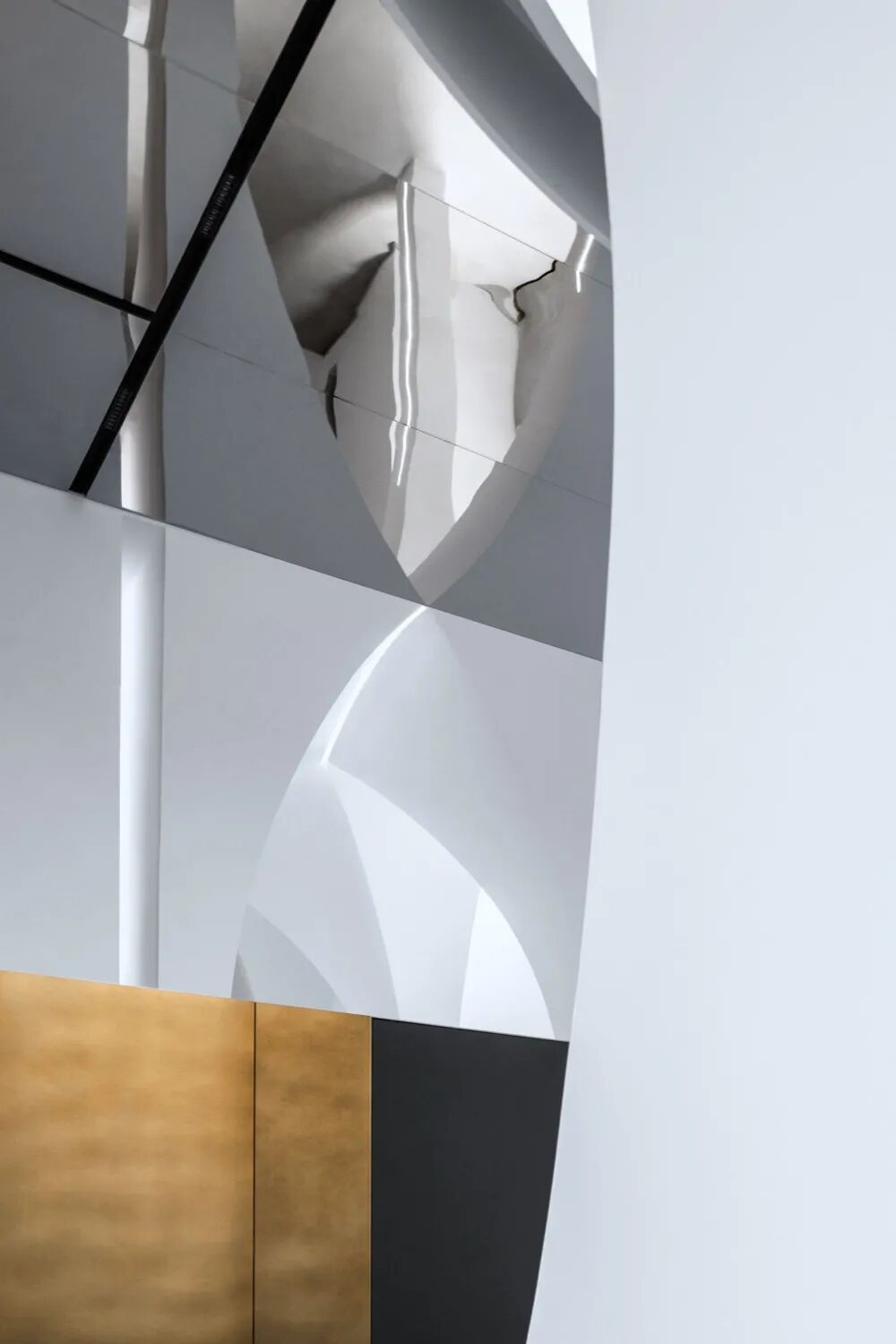 安东尼奥·高迪说过,“直线属于人类,而曲线归于上帝。”弱化过多的直线和平面,以圆形、镜像、双曲线、抛物线各种变化组合成充满韵律动感的异形空间。纯白的光线洒落在空间中心,天空被打开了一道通往另一个时空的洞口。