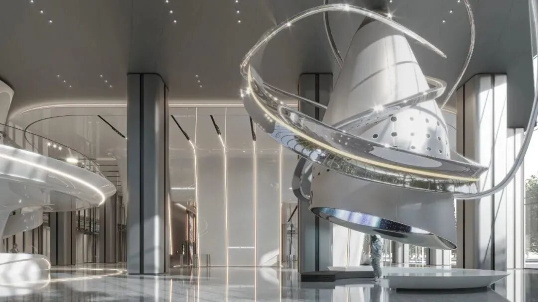 The huge and bright rocket thruster becomes the focus of space vision with the exaggerated sense of science and technology of material and shape itself, hanging from the height of the two layers of space, and reflecting each other with the ground. Inside the thruster is a circular LCD screen that gives visitors an immersive experience.