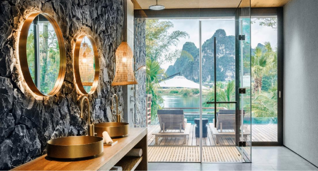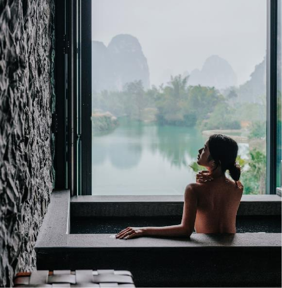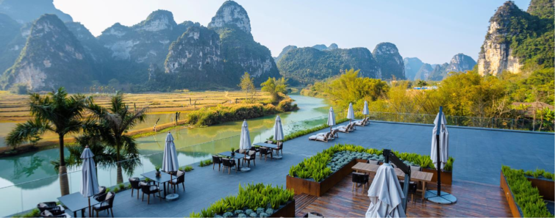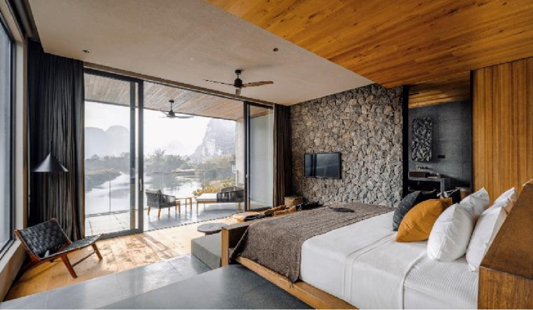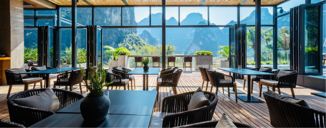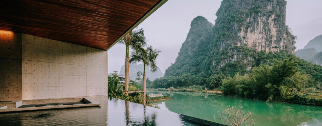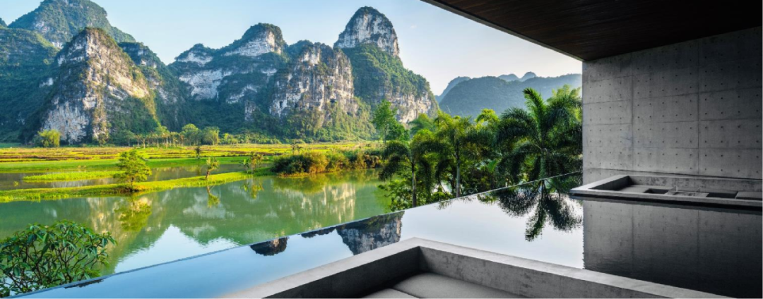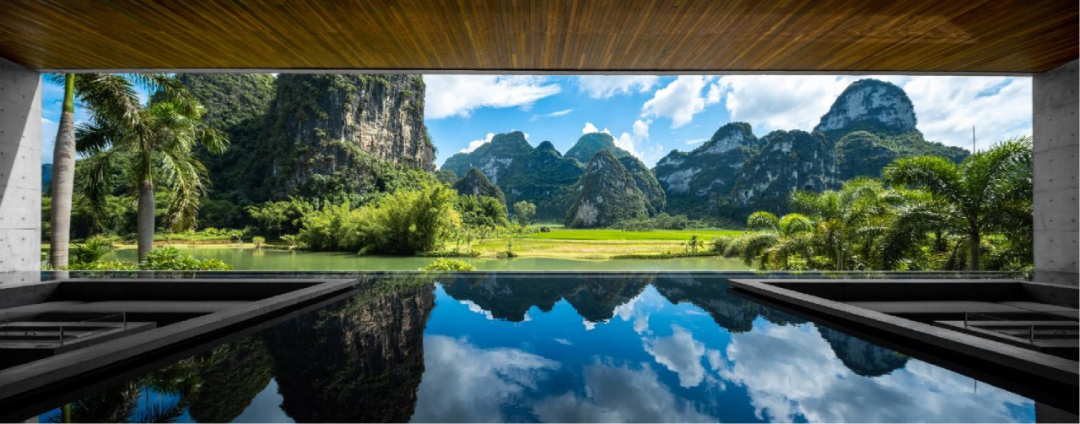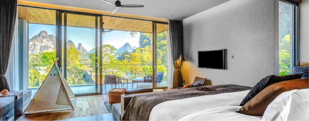 所有客房均设有宽敞的阳台、使用大面积落地玻璃窗,形成特制的“空间景框”,将环绕的喀斯特美景尽数引入,虚实之间与自然巧妙融合。并且,每间客房的景观视野互不干扰,与自然的对话是私密的,独享的。