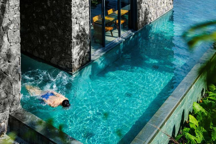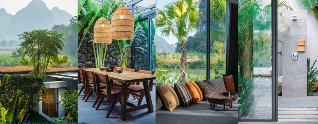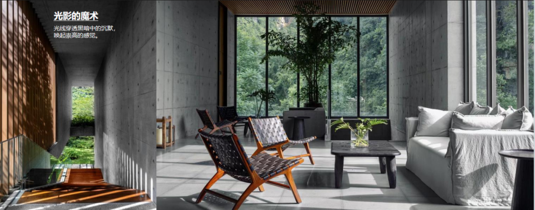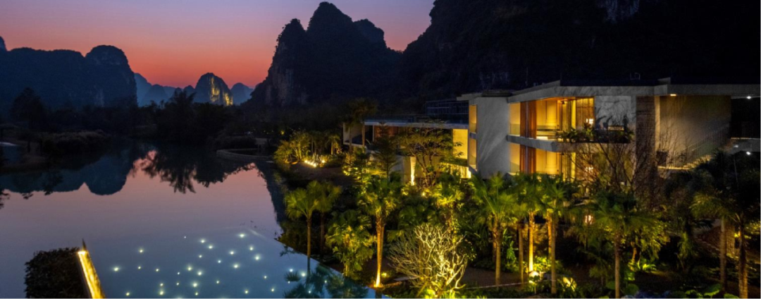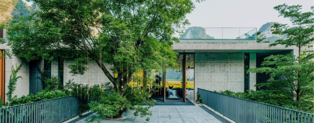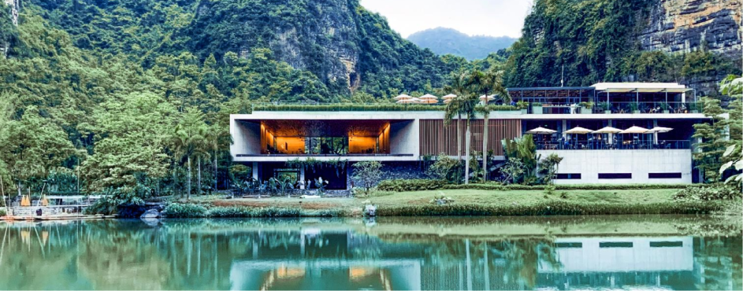 度假村的建筑主体借鉴了壮族传统吊脚楼的特色元素,形成架空、悬挑的建筑形态。墙体大面积使用了当地的石材和清水混凝土,舍去多余的装饰,突显材料本身的色泽和肌理,以弱化室内外的界限,表现简约时尚、大气优雅之美。