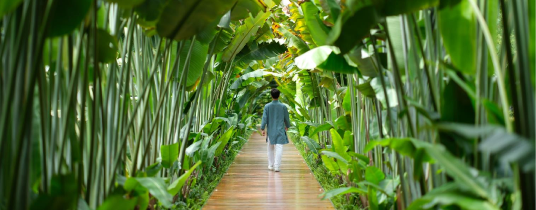 设计敏锐地捕捉到自然环境,尊重原始地貌与植被,创造多层次化的空间,从芭蕉栈桥到架空梯厅,上至二层平台转向酒店大堂,再到空中游廊,移步移景,步步有景。