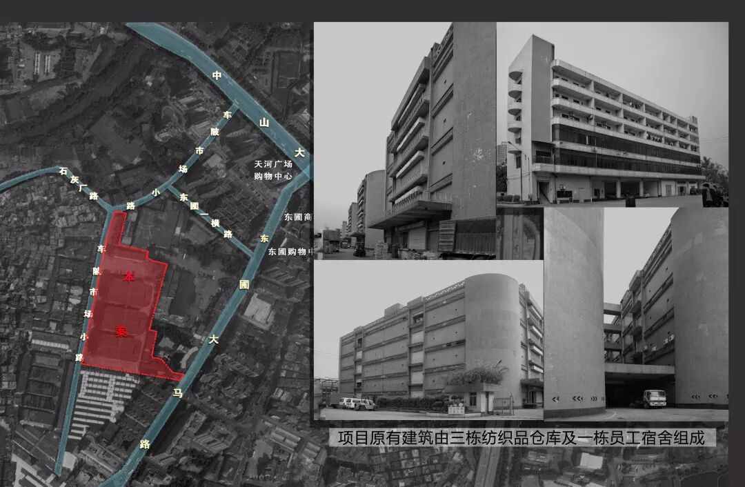 项目原为广州纺织品进出口集团三栋仓库及一栋员工宿舍的建筑群体,更新激活后,成为区域巨具代表性集综合商业、办公、酒店于一体的小型综合体。