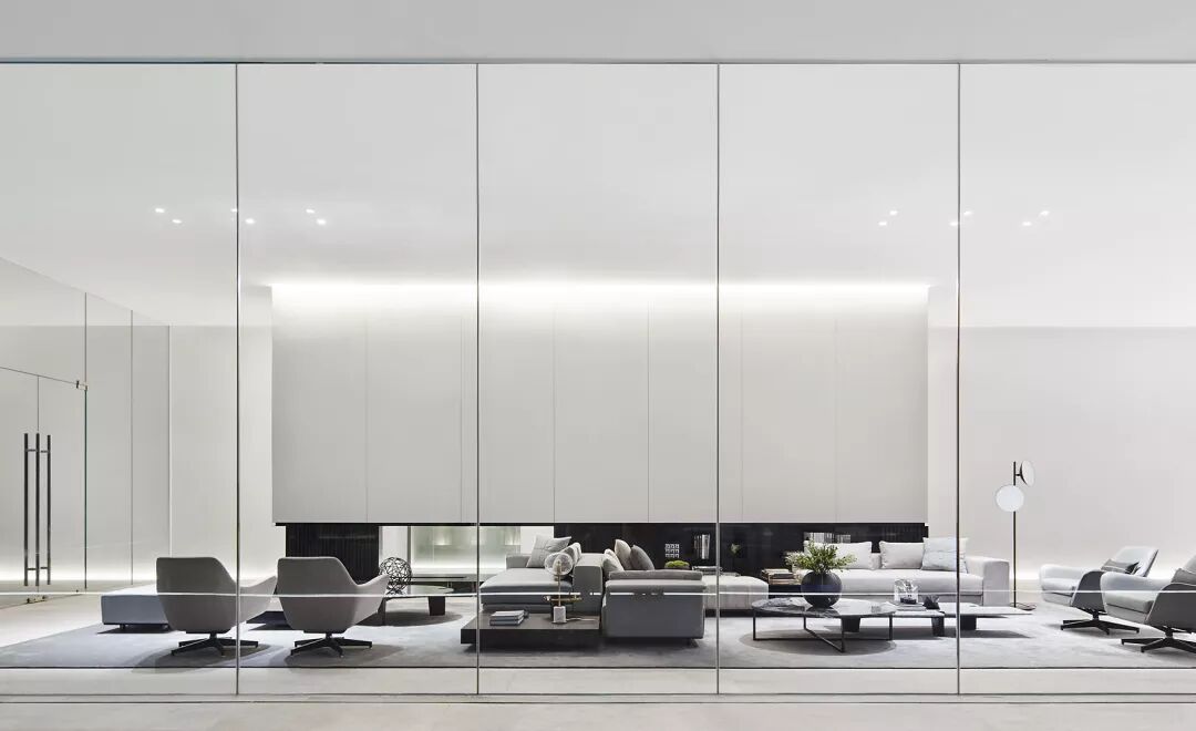 春晓接待中心以一座纯白的柏拉图式的极简建筑,坐落在绿茵草地上,大美至简的现代主义设计手法兼备了中式传统美学的“留白”意韵,令这处建筑化成”纯粹”的符号。剪力墙外悬挑顶板,使其变成无立柱空间,一种戏剧的表现力在这里展开,以玻璃取代墙面,让室内外互相渗透、无垠无界,几何化的空间语言配以简约的空间内饰,设计的统一性与完整性得到体现,并带来轻盈灵动、徜徉流动的感受,让室内外、动与静达到巧妙的平衡,一个放松舒适的乌托邦意味的“城市客厅”也就悄然出现,静谧安然却有着震撼人心的力量。