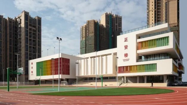 以五彩书院为设计概念,通过左右悬挑的书本与入口台阶,营造书山有路勤为径的意境。运动区与教学区之间,通过建筑悬挑和架空的看台,组成丰富的交流空间。立面在白色外墙中镶嵌五彩金属遮阳板,凸显新时代小学的设计特征。