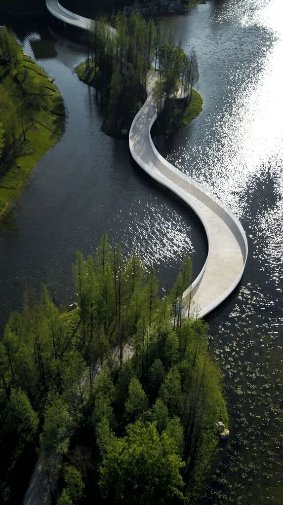 婉转绵延的桥飘浮在湖面,使长桥、湖光与绿岛共同生长,建筑、景观与场地相辅相成。它不仅连接着两岸,还连接着两岸的人,连接着人与故乡。